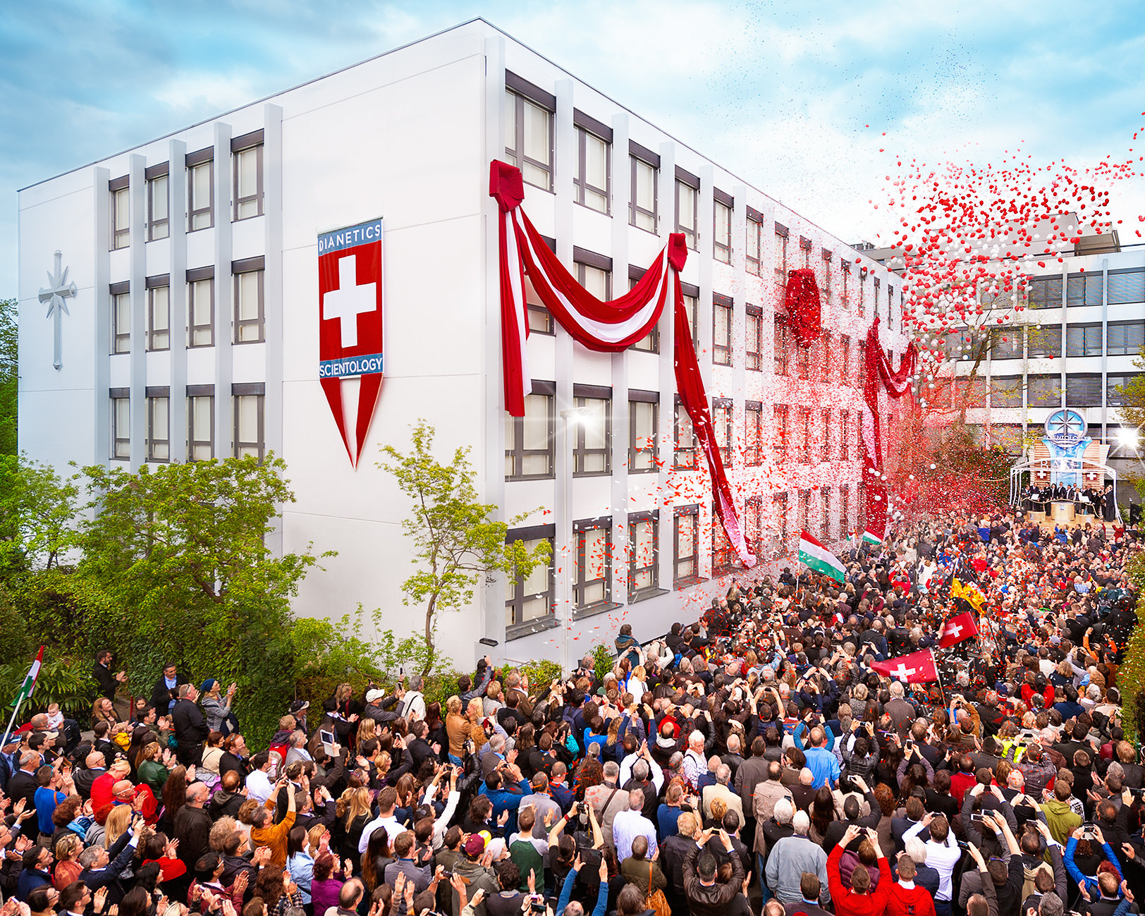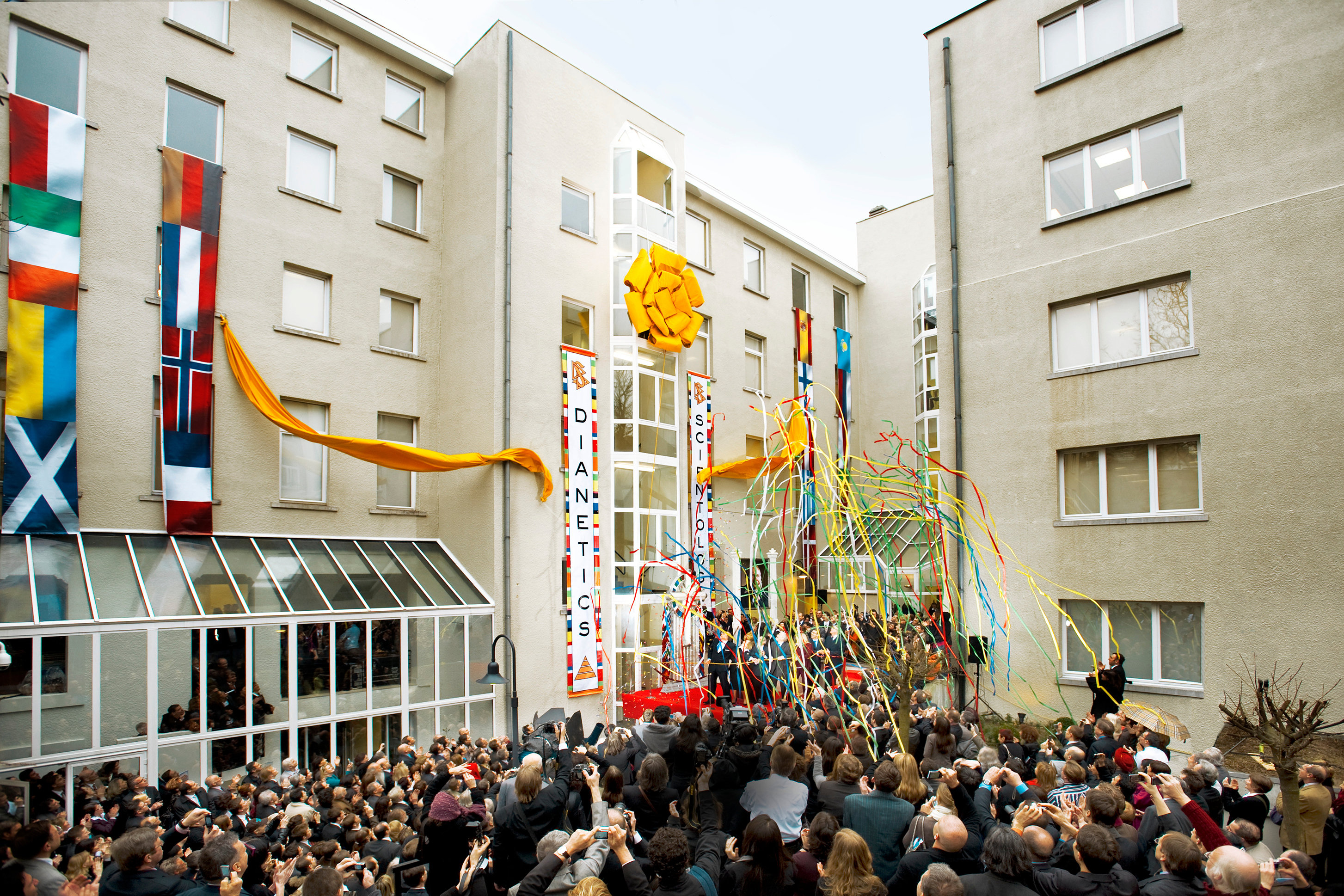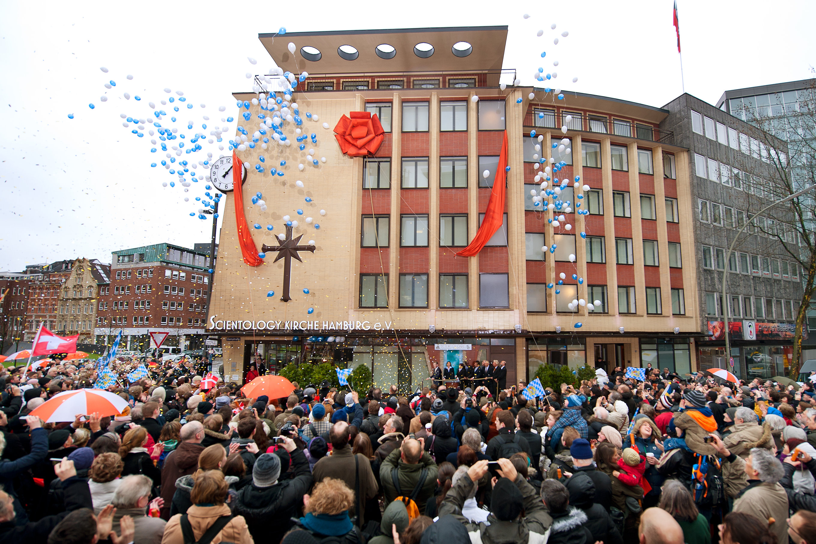 Des drapeaux sont agités et les Scientologistes, invités et personnalités applaudissent pour saluer la transformation d’une nouvelle église de Scientology dans le centre du quartier historique de Hambourg.