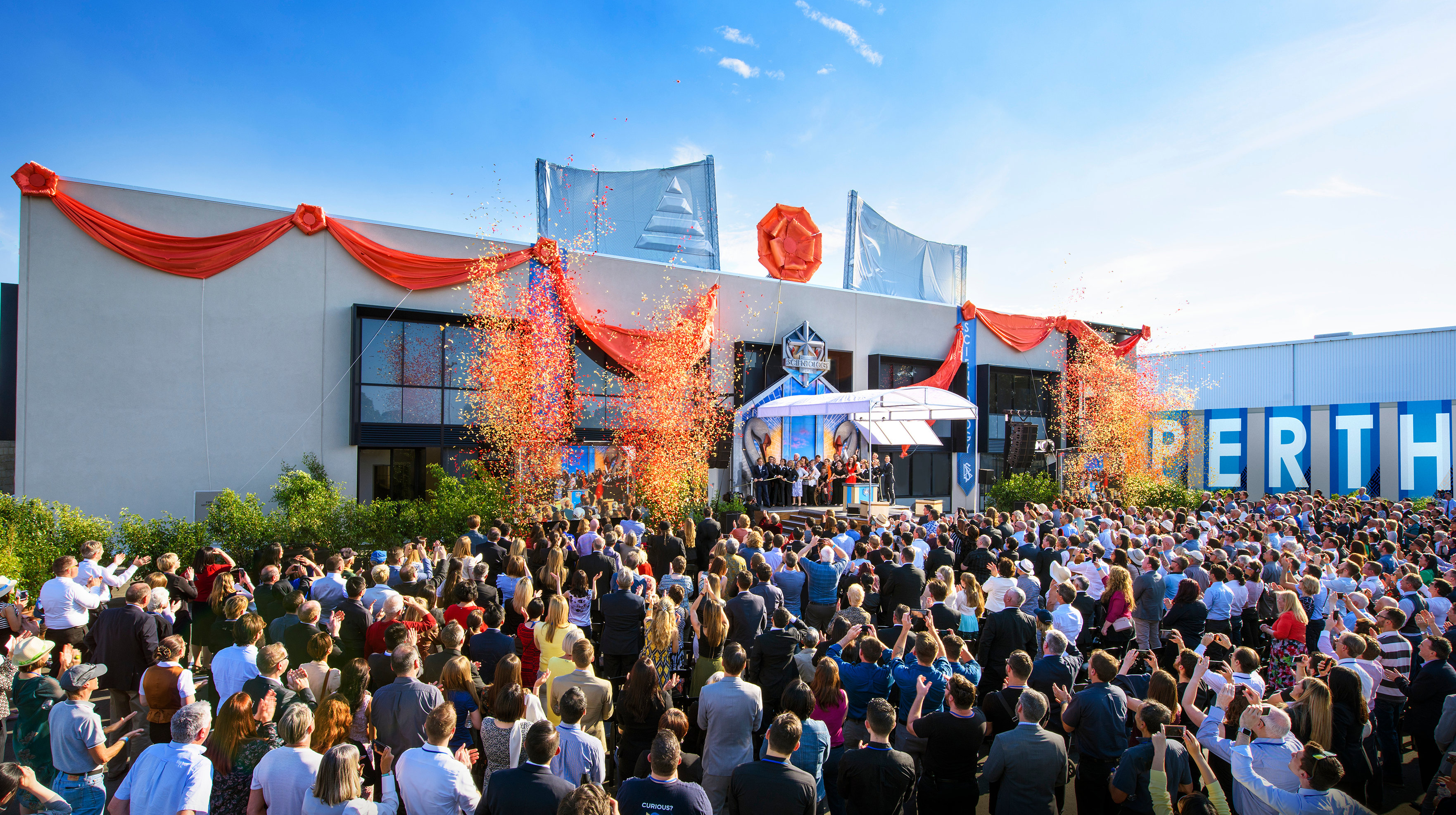 Dans le quartier animé de la vieille ville, des milliers de personnes se rassemblent avec impatience pour assister à la chute du ruban sur un bâtiment historique entièrement restauré et nouvelle église de Scientology de Pasadena.