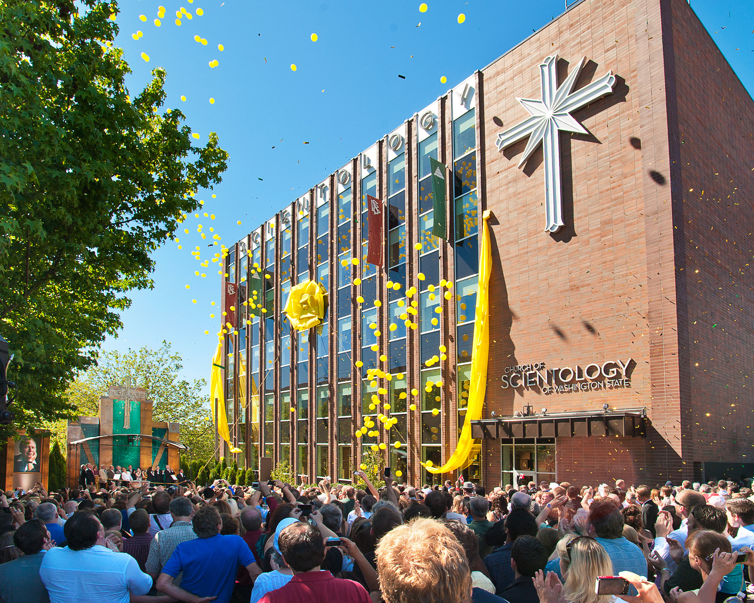 Au milieu d’une explosion de confettis et d’un nuage de ballons, plus de 4000 personnes applaudissent triomphalement alors que le ruban tombe sur la première église de Scientology de Taïwan.