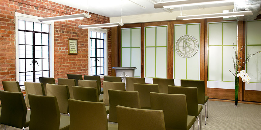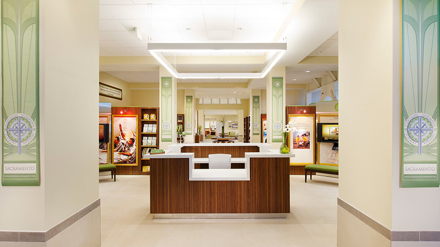 Le nouveau bâtiment de l'Eglise, situé à seulement quelques pas du Capitole de l'États, est l'un des plus éminents monuments de la ville. Connu initialement en 1930 sous le nom d'Hôtel Ramona et conçu par le premier architecte d'États californien, le bâtiment est le plus bel exemple du style néo-colonial espagnol de Sacramento. L'Église a soigneusement préservé la structure de l'édifice et a restauré son aspect pour lui redonner sa gloire d'antan, notamment en conservant son stuc très caractéristique, ses briques vernissées ornementales et ses tuiles en terre cuite, mais aussi ses ouvrages décoratifs en fer forgé et son enseigne d'origine. Toute la restauration a été planifiée et réalisée de manière à entraîner un impact minimal sur l'environnement et pour une durabilité maximale, respectant les normes de certification Or américaines du LEED (Leadership in Energy and Environmental Design) du Conseil du Bâtiment durable.