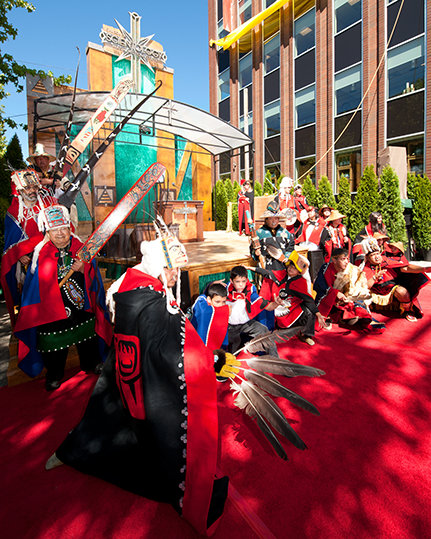 Cecile Hansen, présidente de la tribu Duwamish et descendante du chef Seattle qui donna son nom à la ville, a ouvert l’inauguration par une cérémonie traditionnelle vieille de plusieurs siècles, pour accueillir l’Église dans son nouveau foyer.