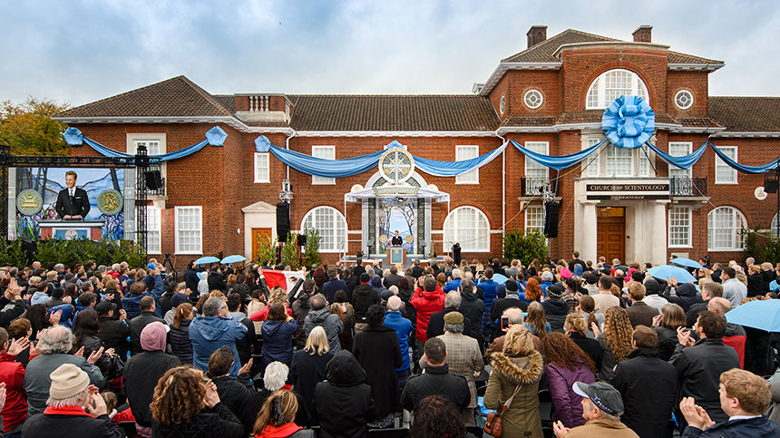 Dans l’esprit du jour M. Miscavige a pris la parole et a proclamé : « Quand ce ruban tombe, un rideau se lève... et cela devient donc la responsabilité de chaque scientologue d’améliorer le sel de la Terre de l’Angleterre, transformant ainsi une révolution industrielle en une révolution spirituelle. »