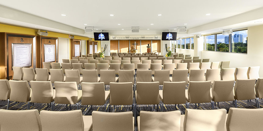La chapelle de la nouvelle église de Scientology de Miami est conçue pour accueillir de grandes réunions, comme les services dominicaux, les mariages et les baptêmes. C’est aussi le cadre parfait pour des journées d’information, des réunions, des déjeuners et des banquets mondains pour les membres de toute confession.