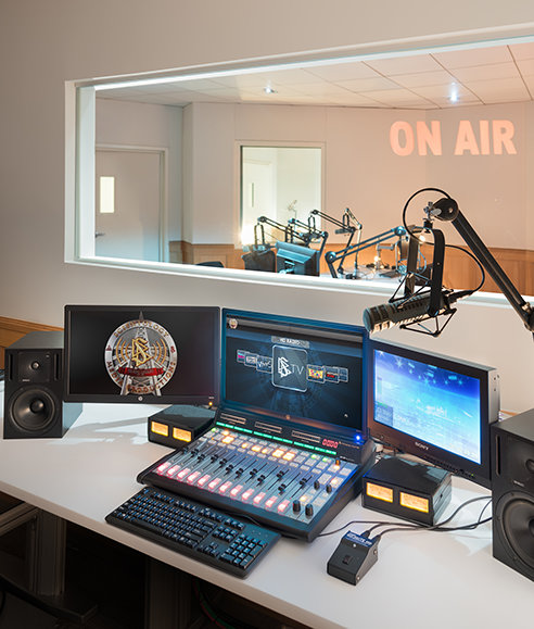 Donc, par rapport aux 95 % de la population mondiale qui écoutent la radio tous les jours et au spectateur moyen qui passe environ 40 heures par semaine collé à la télévision, la réponse évidente était : avoir notre propre station de radio, notre propre chaîne de télévision et nos propres installations de radiodiffusion. »