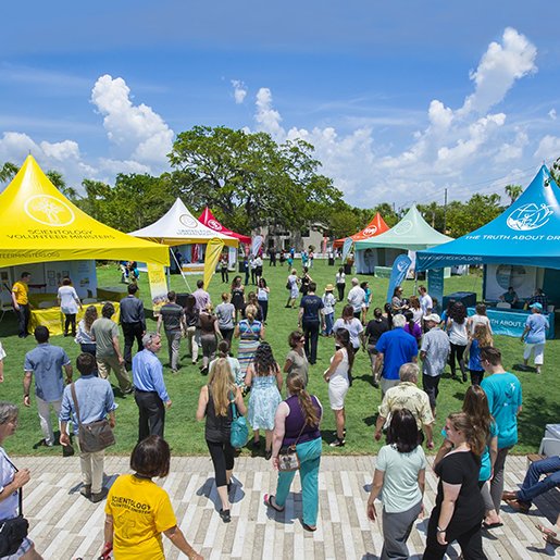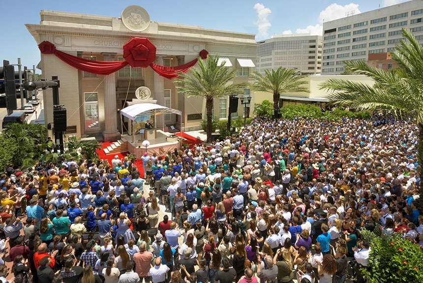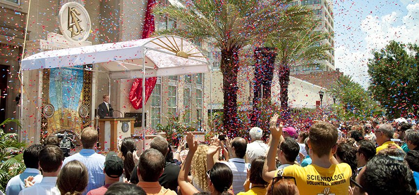 Quatre mille scientologues et leurs invités ont convergé, le samedi 11 juillet, vers le centre-ville de Clearwater pour la célébration de coupé de ruban du vaste et nouveau centre d’information de l’Église de Scientology, dans un endroit situé au milieu de la base à terre de Flag, à proximité du quartier général spirituel de la religion. Ce centre est dédié à l’essor des programmes humanitaires renommés de la religion qui étendent leur influence sur le monde entier.