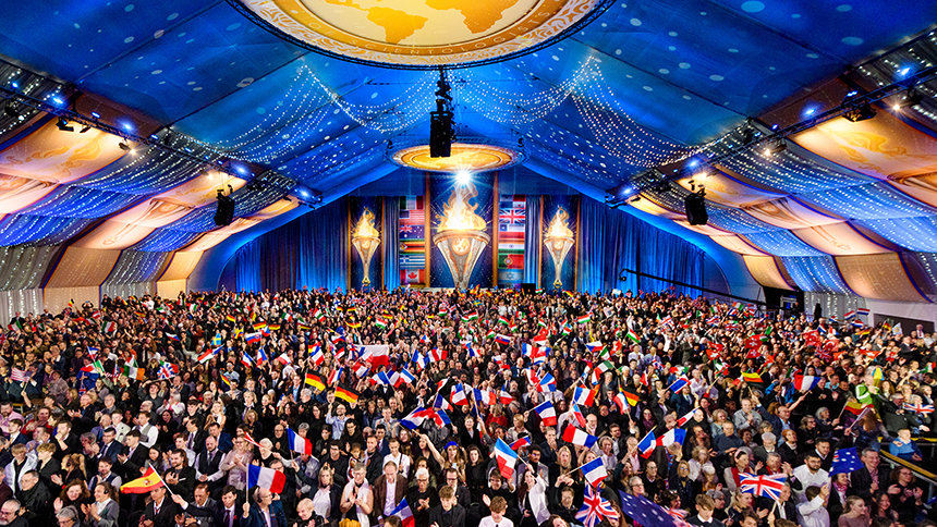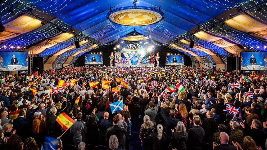 La foule impatiente venant de divers endroits du Royaume-Uni, d’Europe, des États-Unis et d’aussi loin que d’Afrique et d’Asie, a foulé le tapis rouge pour se rendre dans la grande tente. Alors que la scène s’illuminait, marquant le début de la célébration, M. David Miscavige, Président du conseil d’administration du Religious Technology Center, est arrivé au milieu d’un tonnerre d’applaudissements d’une durée historique.