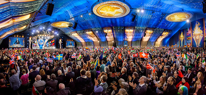 Le samedi soir, la grande tente est devenue le lieu de la célébration du bal annuel des Patrons de l’IAS. Les membres de l’IAS de 59 pays, d’une élégance rare, ont été reconnus pour leur dévouement constant à promouvoir le mouvement humanitaire de l’IAS. La soirée était d’autant plus importante que, durant les quatre années qui ont suivi le dernier bal des patrons à Saint Hill, près de 5 000 Scientologistes sont devenus Patrons de l’IAS, un record dans l’histoire.