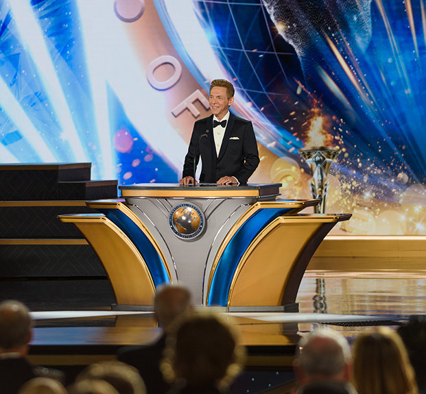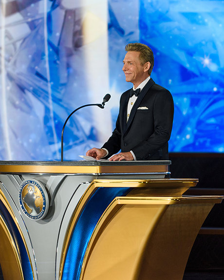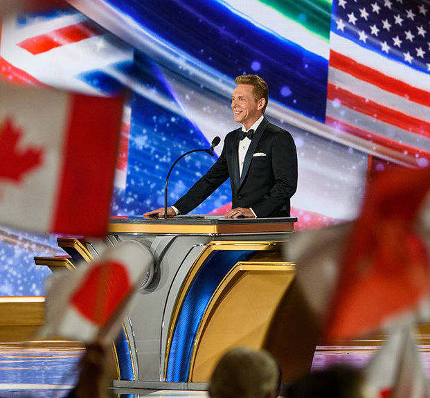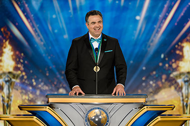 M. David Miscavige, le leader ecclésiastique de la religion de Scientology, monte sur scène dans la Grande Tente devant la foule en liesse qui attend le début d’une soirée inoubliable.