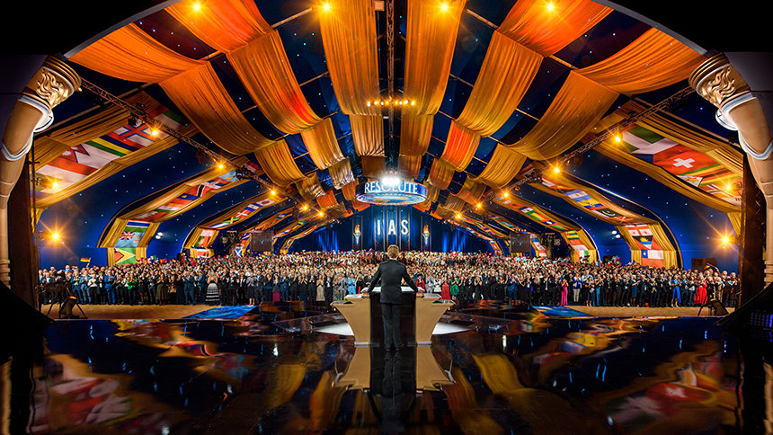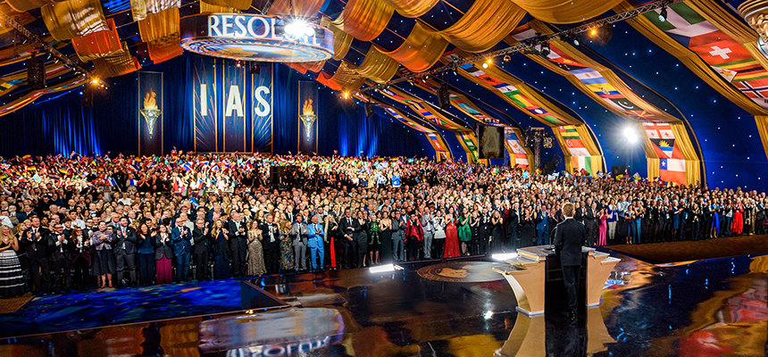 « Bienvenue à cette soirée où nous invoquons l’esprit de l’IAS, un esprit qui est né d’une unité parfaite et qui imprègne l’air même que nous respirons, » a commencé M. David Miscavige, le leader ecclésiastique de la religion de Scientology. « Car ce soir, cet esprit de l’IAS est omniprésent, universel et immortel. »