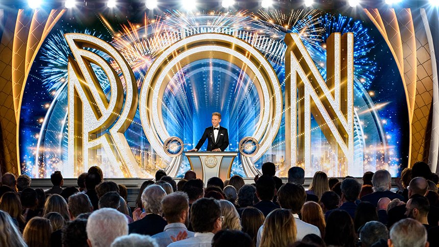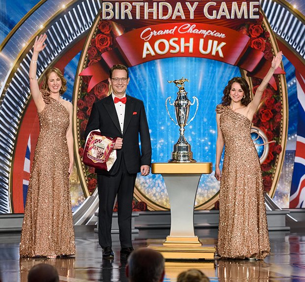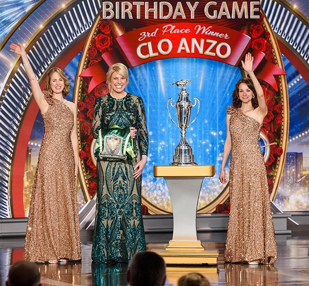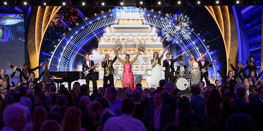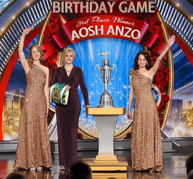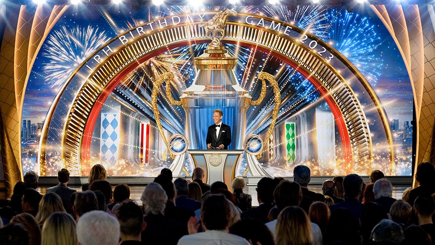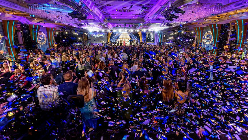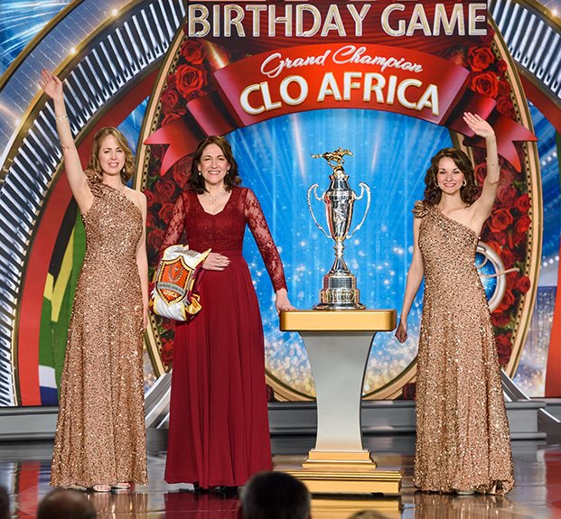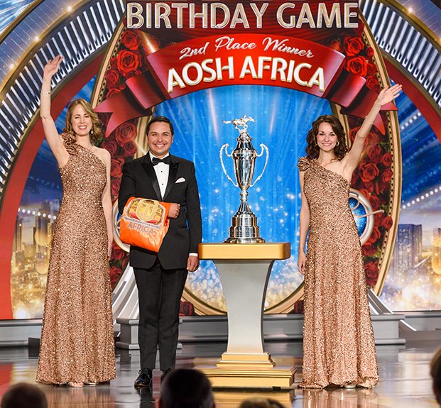 Ensuite, le moment est venu d’annoncer les champions du jeu de l’anniversaire de LRH. La scène s’est transformée en un cercle de gagnants, entourée de lumières scintillantes, de casaques et de trophées resplendissants. Le jeu de l’anniversaire perpétue la tradition d’honorer M. Hubbard avec le cadeau de l’expansion dans chaque Église de Scientology.