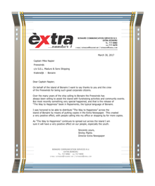 Et finalement, un représentant du ministère du tourisme de Saint-Christophe-et-Niévès a déclaré : « Même si nous ne le disons pas suffisamment souvent, ou assez fort, rappelez-vous, les Caraïbes apprécient le Freewinds. »