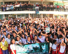 Alors la présentation des accomplissements touchait à sa fin, un évènement d’une importance considérable a été dévoilé. Et il arrive directement dans le sillage du Freewinds en tandem avec le soutien de l’IAS, car en travaillant avec des bénévoles, la police et les scientologues, des millions d’exemplaires du Chemin du bonheur, La vérité sur la drogue et l’histoire des droits de l’Homme ont été distribués dans les grandes villes et les villages de la jungle à travers toute la Colombie.